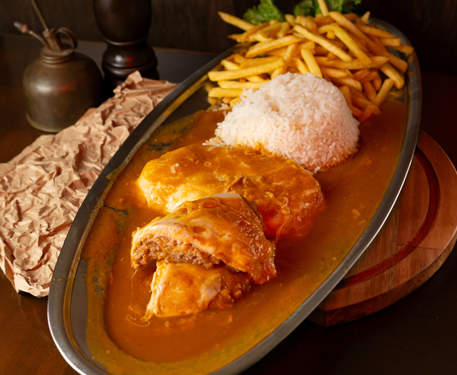 Filé Mignon à milanesa com presuto, mussarela, e molho de tomate especial da casa.